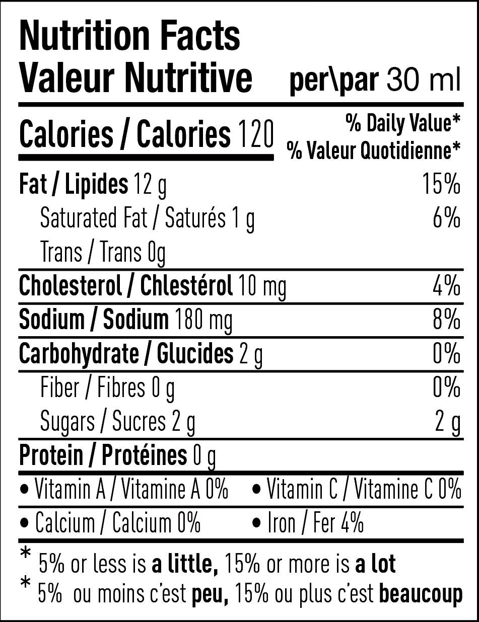Japanese Mayo (canola oil, liquid egg yolk, liquid whole egg, white vinegar, water, sugar, salt, lemon juice concentrate, mustard flour, natural flavours, calcium disodium EDTA), Naturally Brewed Soy Sauce (Water, Organic Whole Soy Beans, Organic Wheat, Sea Salt, Brewing Starter (Aspergillus Sojae),Sriracha Chili Sauce (chili, sugar, garlic, distilled vinegar), Rice Vinegar, H&F Sweet Chili Sauce (Thai Red Peppers, fresh garlic, distilled white vinegar, sea salt, cornstarch), Japanese Sesame Oil, Organic Cane Sugar, Citrus Fibre, Xanthan Gum, Sodium Benzoate, Potassium Sorbate.